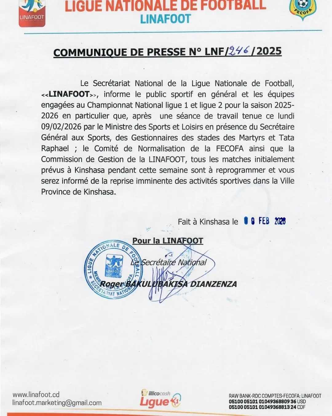 La Ligue Nationale de Football (Linafoot) a annoncé, dans un communiqué publié le 9 février 2026, l’annulation de tous les matchs de la Ligue 1 prévus cette semaine à Kinshasa. Cette décision fait suite à la fermeture temporaire du stade Tata Raphaël par le Ministre des Sports et Loisirs, Didier Budimbu, à cause des incidents récurrents survenus lors des rencontres.