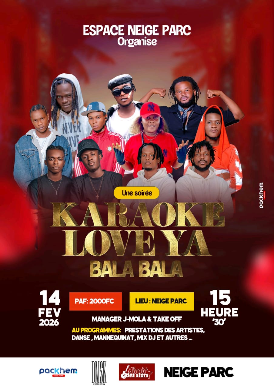 À l’affiche de ce »Spécial Saint Valentin » intitulé Karaoké Love Ya Bala-Bala : KF Familly (Mister Bez et Nimi Face B), 5 Sélection Mbila et Les Dangereux de la Zik, des groupes bien connus de la scène musicale urbaine locale. Le prix d’accès est fixé à 2.000 FC, avec des places annoncées limitées.