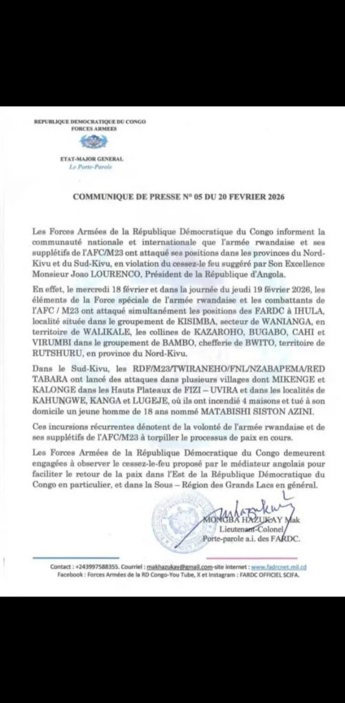 L’armée rwandaise et ses supplétifs du M23/AFC ont attaqué des positions des Forces Armées de la République Démocratique du Congo (FARDC) les 18 et 19 février dans les provinces du Nord-Kivu et du Sud-Kivu, selon un communiqué de l’état-major général.