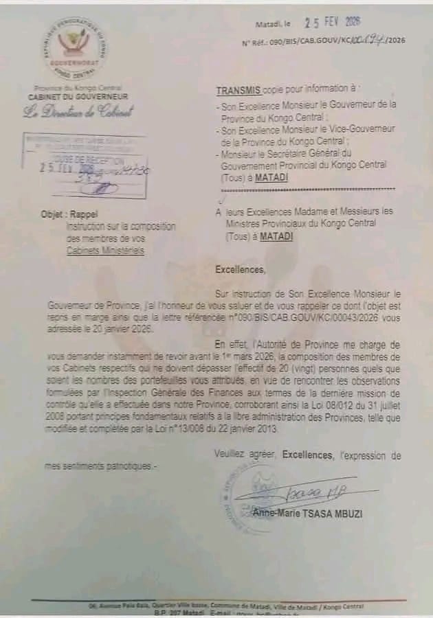 À travers une correspondance datée du 25 février et signée par Madame Anne Marie Tsas, Directeur de Cabinet du Gouverneur Grace Nkuanga Bilolo, le Chef de l’exécutif provincial a rappelé que les cabinets des ministres provinciaux ne peuvent pas dépasser 20 membres, quel que soit le nombre de portefeuilles.