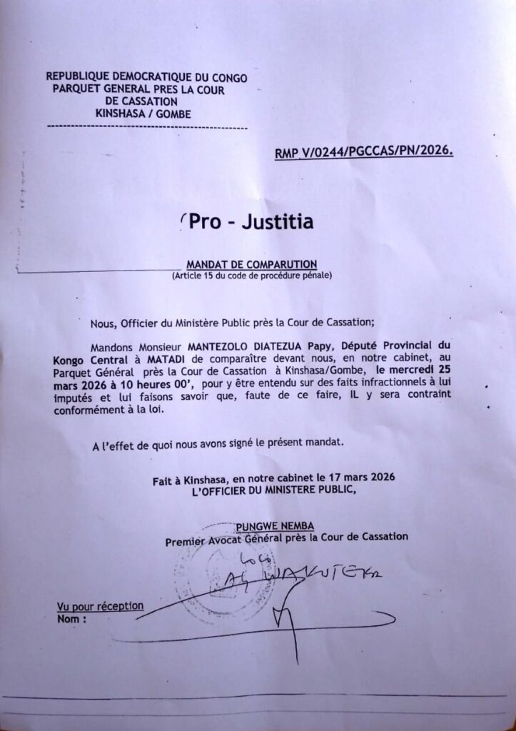 L’élu provincial de Luozi et ancien président de l’Assemblée provinciale est appelé, via un mandat de comparution reçu ce vendredi 20 mars par l’Assemblée provinciale du Kongo Central, à se présenter au cabinet du Premier avocat général près la Cour de cassation.