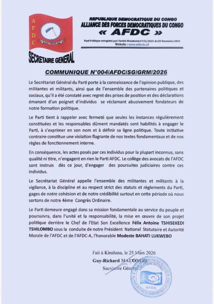 Faisant suite à la communication de ce mercredi 25 Mars 2025 d’un poignet de personnes réclamant les postes de co-fondateurs du parti politique AFDC-A, le secrétariat général du parti de Bahati Lukwebo réagit incessamment qualifiant cette démarche d’illégale et de non-événement.