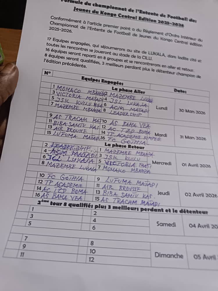 À l’issue de ce tirage, les clubs du Cercle de Football des Jeunes de Songololo (CFJSong) engagés dans cette compétition, connaissent désormais leurs adversaires. Il s’agit de : FC Gothia vs Lufuma (Matadi), TP Académie vs Air Brousse (Matadi), Bana Vea vs Tracam (Matadi), Leadership vs Mazembe de Mb/Ngungu ainsi que Mazembe de Lukala vs AS Monaco (Mb/Ng)