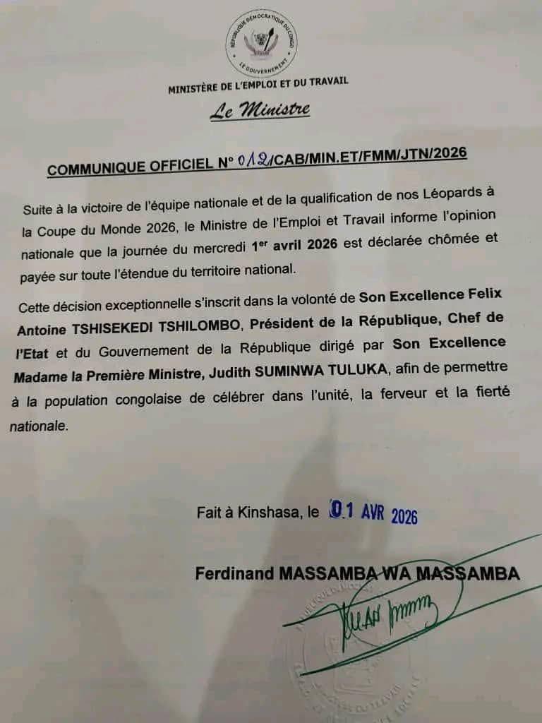 PolitiqueRDC : le 1er avril 2026 décrété chômé et payé pour célébrer la qualification des Léopards (Communiqué)01/04/2026Partager l'article Previous ArticleFootball : la RDC s’impose face à la Jamaïque (1-0) au bout de la prolongation et retrouve le Mondial 52 ans plus tard Autres actualités 📰 Équateur : une pétition pour la dissolution de l’Assemblée provin ... 31/03/2026 Kongo Central : démission d’un conseiller du gouverneur, Mbuta De ... 30/03/2026 RDC : Judith Suminwa clôture le forum des femmes sur l’intégrati ... 30/03/2026