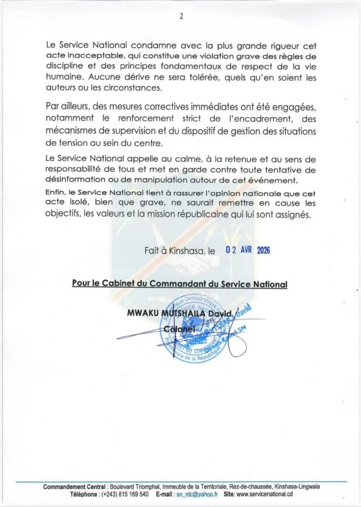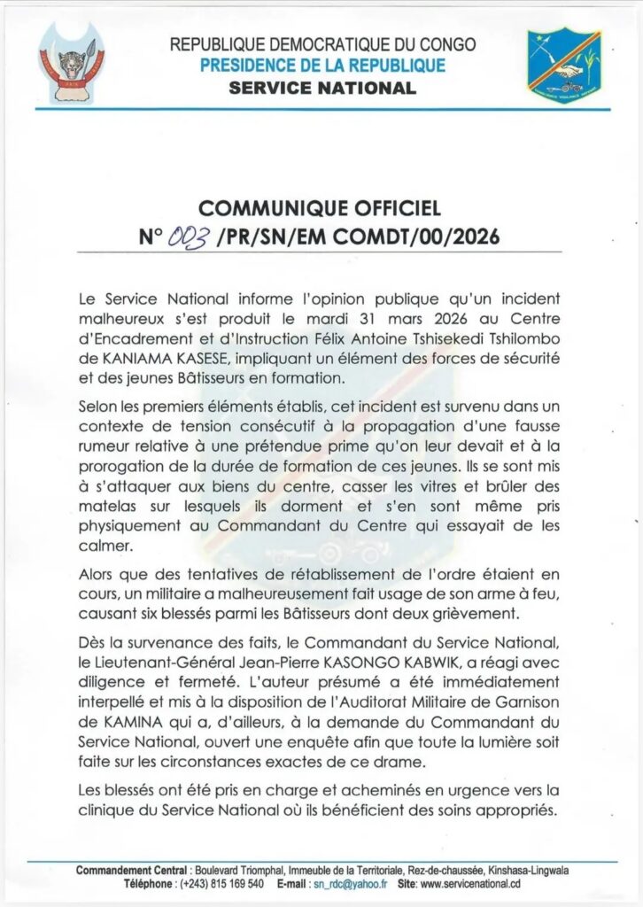 Le Service National a annoncé, à travers un communiqué officiel rendu public ce jeudi 2 avril, la survenue d’un incident malheureux le mardi 31 mars 2026 au Centre d’encadrement et d’instruction Félix Antoine Tshisekedi Tshilombo de Kaniama Kasese, impliquant un élément des forces de sécurité et des jeunes Bâtisseurs en formation.