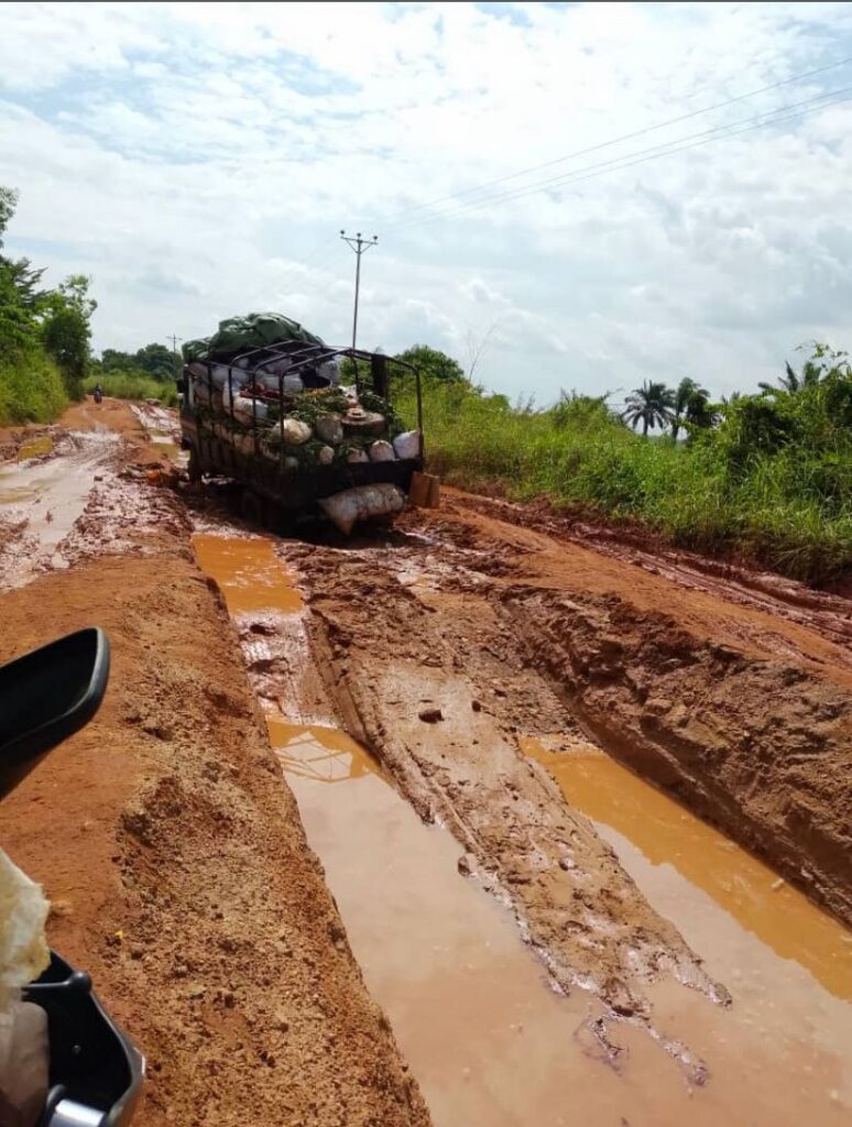 Les eaux stagnent sur de larges portions de la chaussée, tandis que les véhicules s’y embourbent régulièrement surtout en saison des pluies. La route subit également une déformation progressive sous l’effet du passage répété des engins lourds, laissant apparaître des ornières profondes.